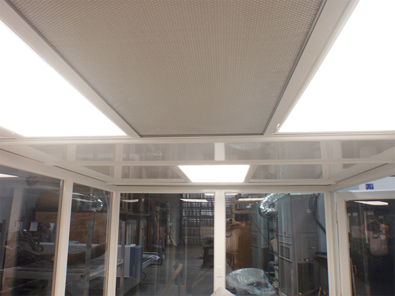 Antimicrobial aluminum construction components featuring 3-1/8" thick 0.20 aluminum powdercoated post and channels connecting 3/16" tempered safety glass(Standard), 1/4" laminated safety glass(Optional), or 1/2" insulated safety glass(Optional). Smooth white enamel coated aluminum panels 0.32 facings over 1#(Standard) or 2#(Optional) density EPS cores. Optional FRP panels. 48" panels and panelized roof and ceiling systems minimize seams and maintenance.