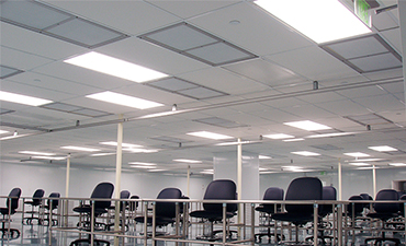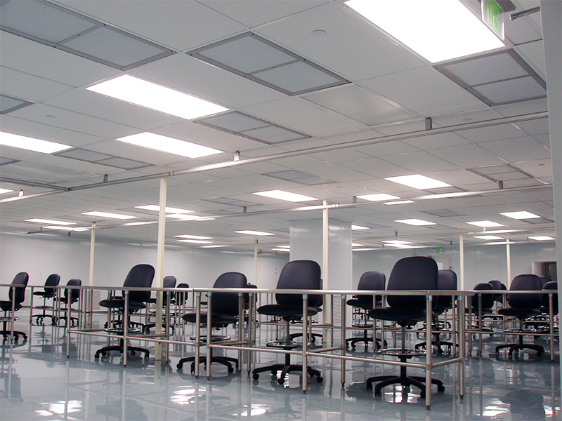 Panelized floating flush ceiling with 48" x 120" ceiling panels and 48" x 120" hanger spacing allows for the the installation of 24" x 48" light fixtures or HEPA/ULPA filtration modules, oriented in either L or W direction, without changing the ceiling panel orientation. Minimizes seams for less positive pressure leakage, maintenance and cleaning requirements, and minimal installation times. Available in 2", 3", 4", and 6" thicknesses for increased spans.